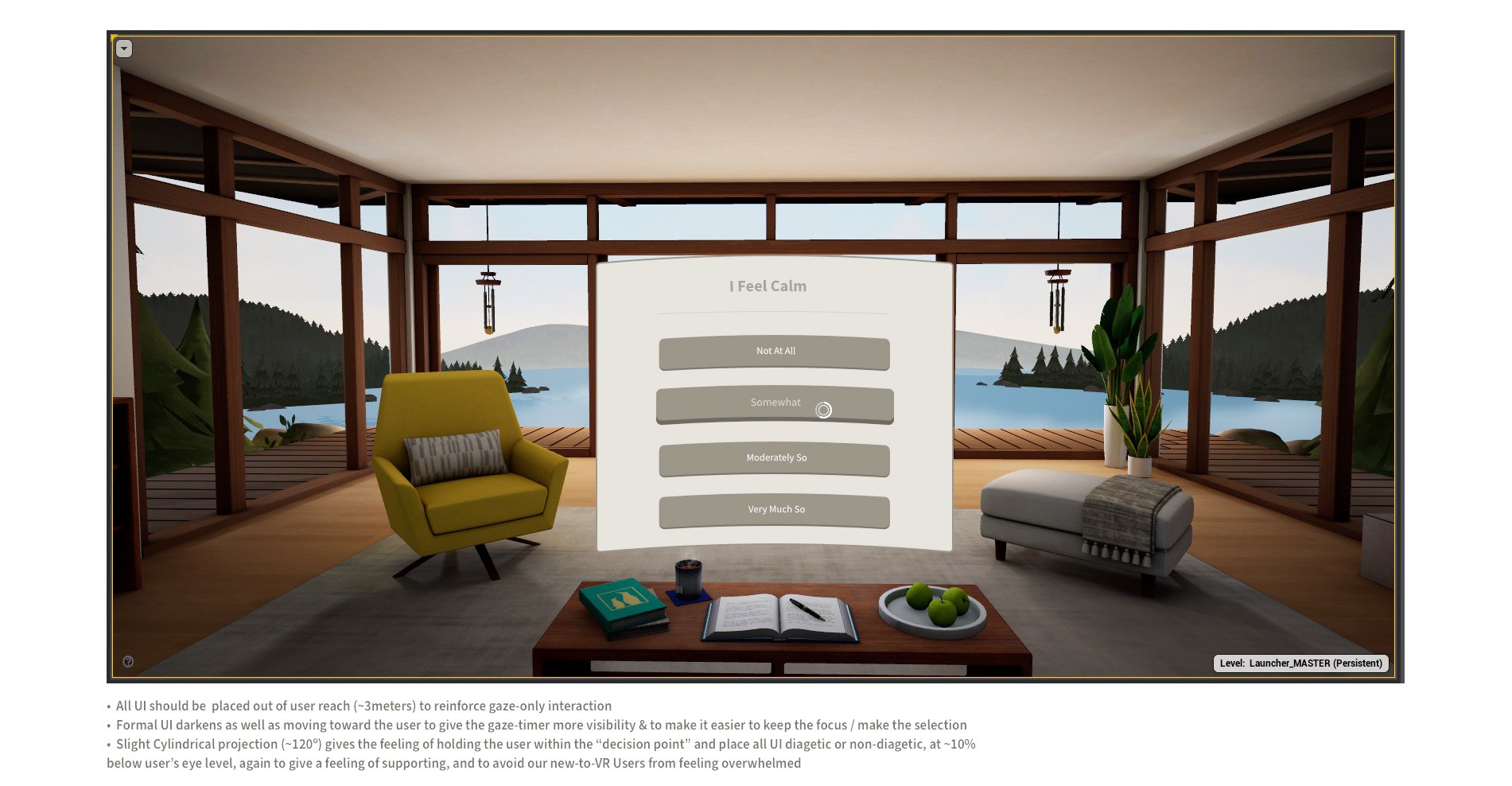 Key Results: The SDK included a sample scene to provide various teams developing content a single UI model to reference if they needed to create their own custom UI elements. As our End Users are VR novices, I set the eye-line of the UI slightly lower than is common and was placed out of arms reach with slight cylindrical projection so the user would feel gently contained & supported by the appearance of a UI panel, not claustrophobic or surprised.